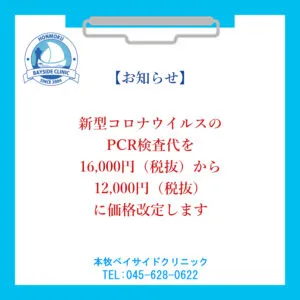 新型コロナウイルスのPCR検査代を16,000円(税抜)から12,000円(税抜)に価格改定します。