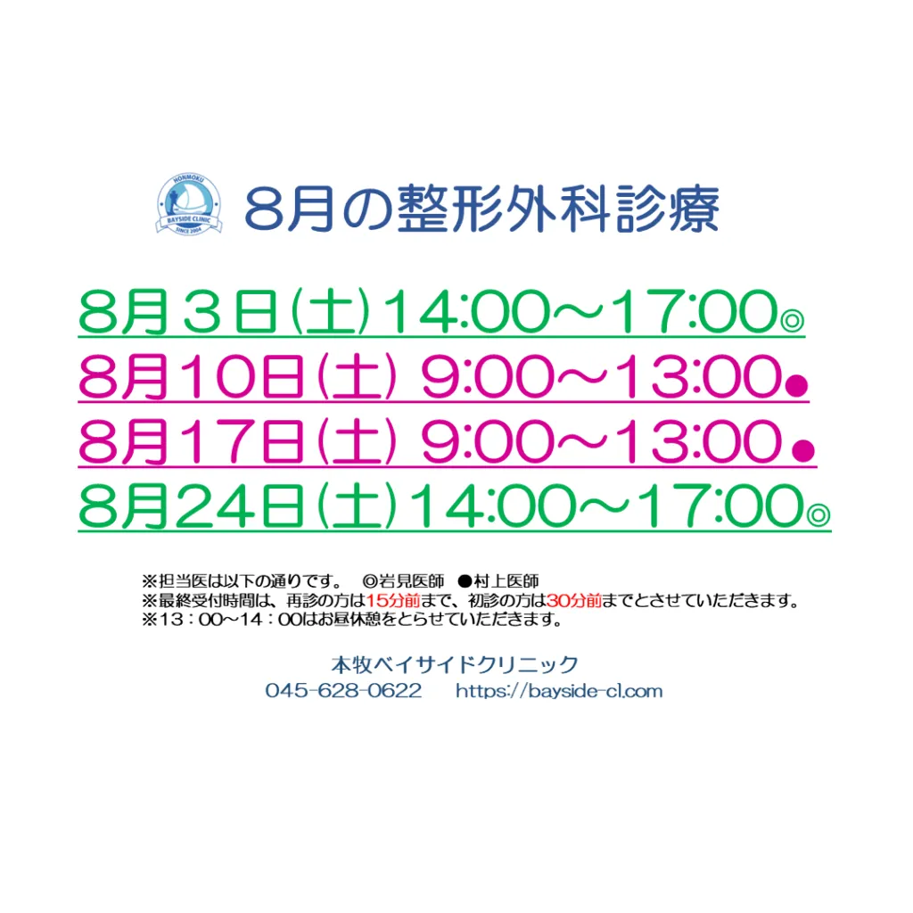 8月の整形外科のスケジュールは下記画像を参照ください😊