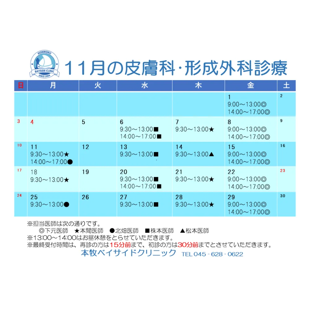11月の皮膚科・形成外科の診察スケジュールになります🍂