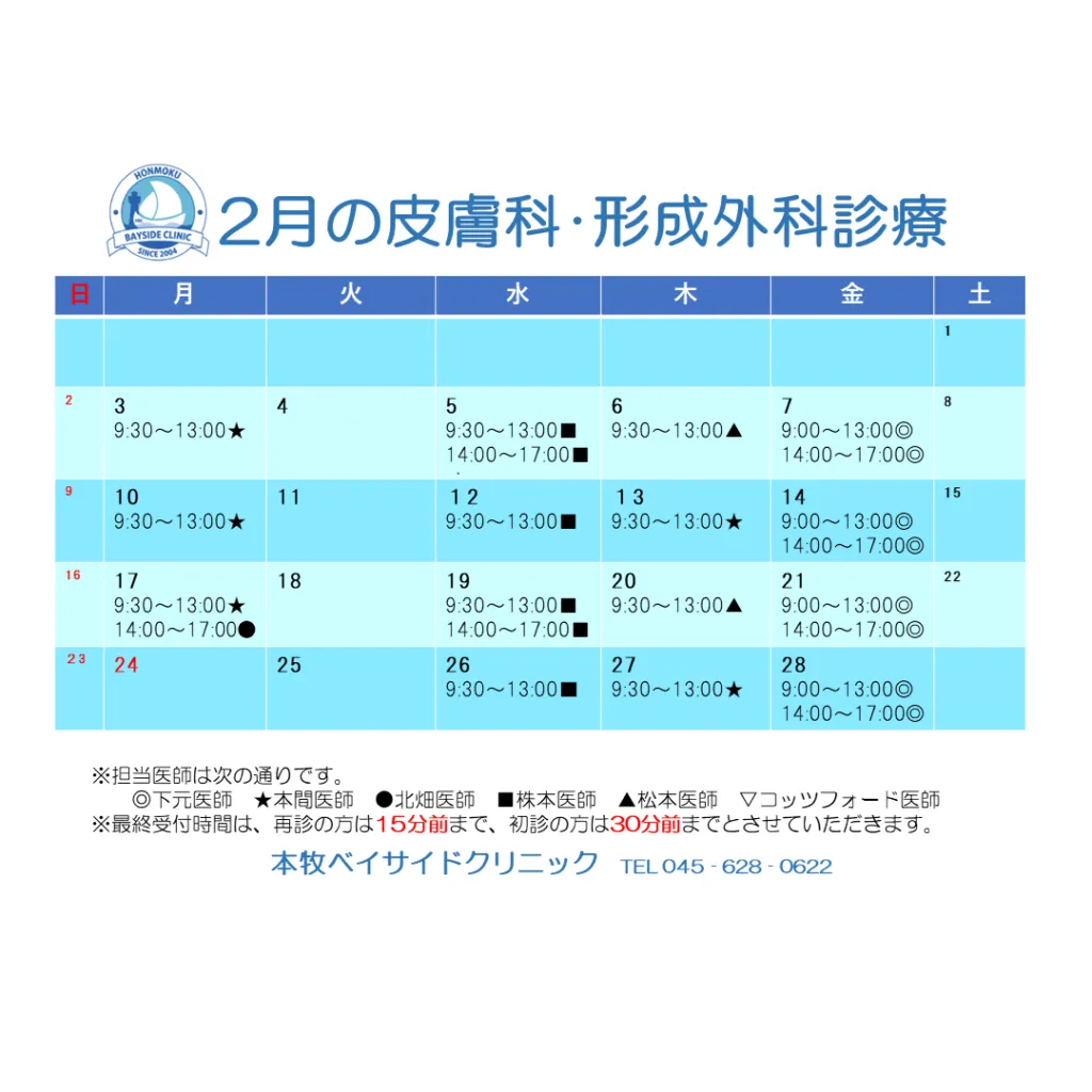 2月 皮膚科・形成外科/整形外科スケジュール