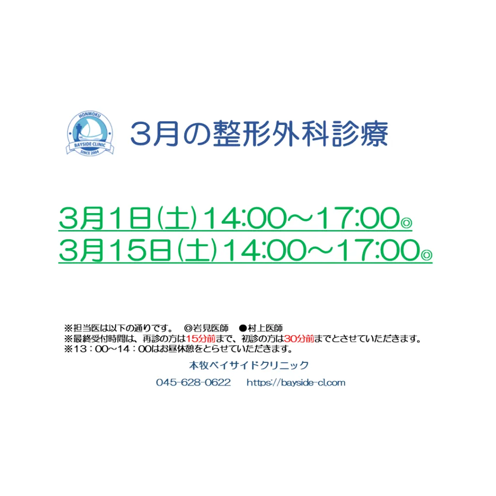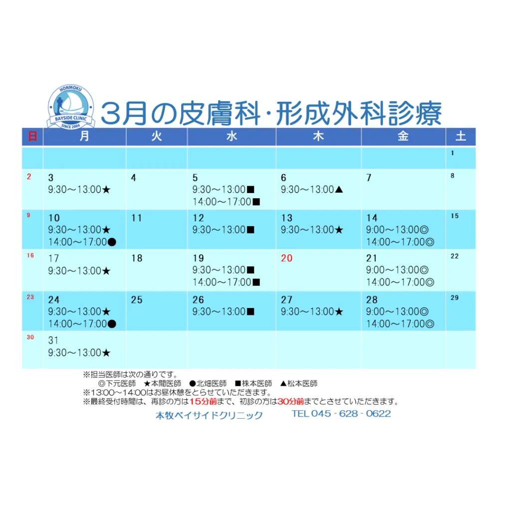 3月の皮膚科・形成外科/整形外科スケジュールは下記画像ご参照ください(o^―^o)