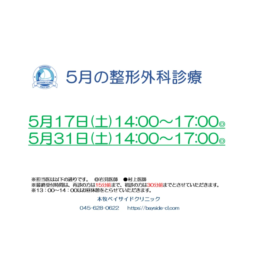 5月の皮膚科・形成外科/整形外科スケジュールは下記画像ご参照ください(o^―^o)