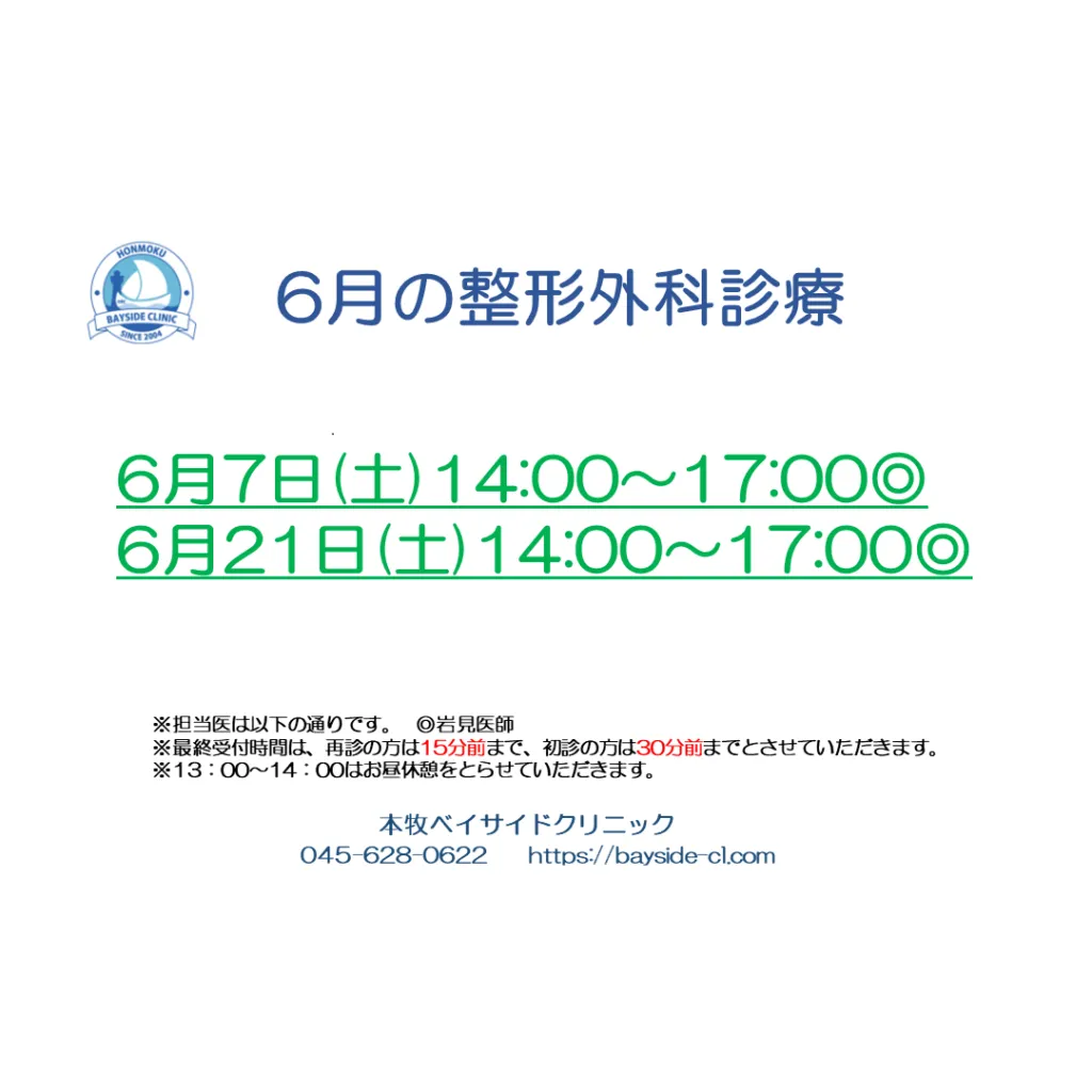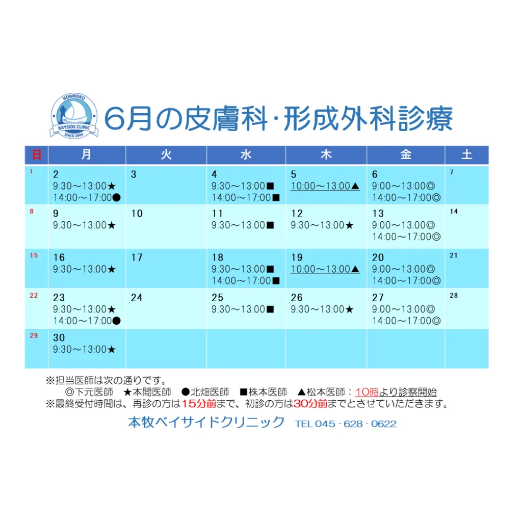 6月の皮膚科・形成外科/整形外科スケジュールは下記画像ご参照ください(o^―^o)