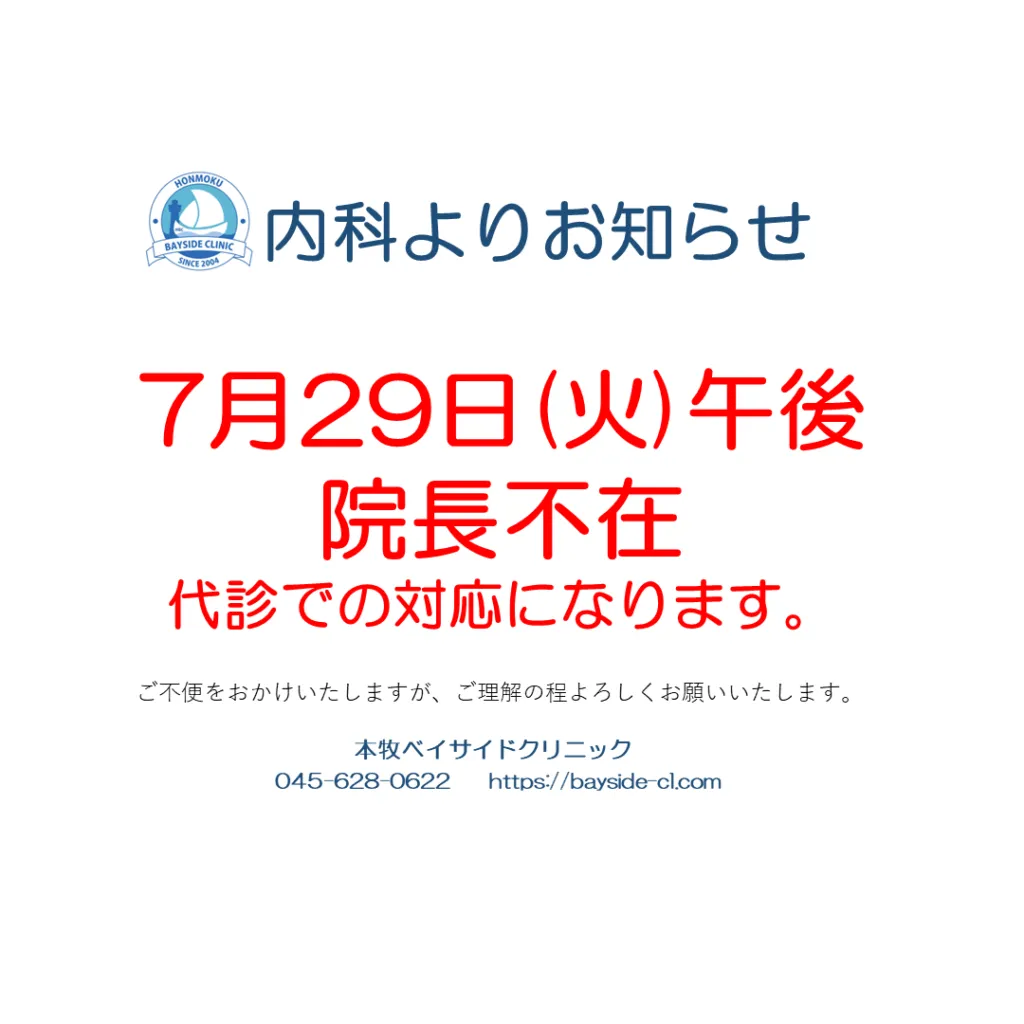7月29日の午後は院長が不在のため代診での対応になります。