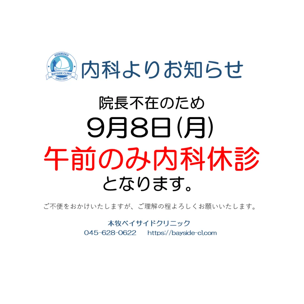 9月8日(月)午前中院長不在のため内科休診とさせていただきます。