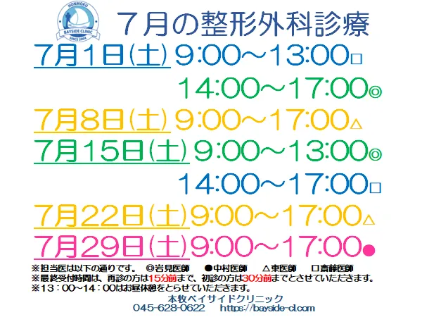 2023年7月の整形外科診察スケジュールは下記の通りです。